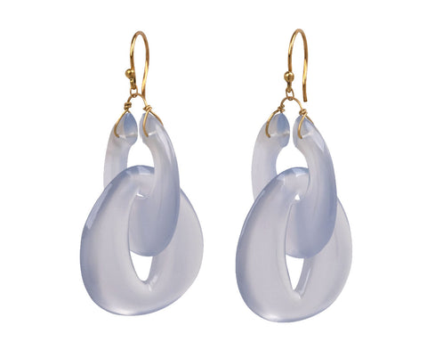 With their pale, cool toned color, these Ten Thousand Things earrings will add the perfect amount of movement and texture to any outfit. The two, smooth hand cut blue chalcedony links hang from the 18K yellow gold ear wires to create the double drop.