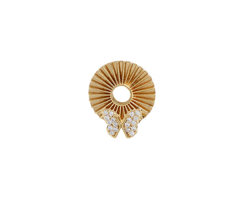 Wear this Foundrae charm with any of their hoop or fob earrings. The 18K yellow gold disk has an engraved surface and a tiny butterfly at the bottom. Tiny sparkling white diamonds cover the butterfly for a hint of sparkle. You could even add this on to a dainty chain!