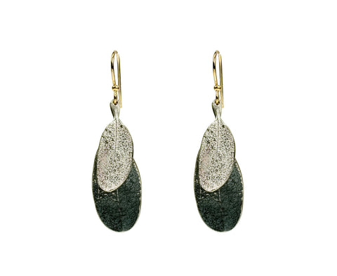 Two meticulously sculpted leaves of different sizes hang together forming an elegant, natural composition. The larger of the two leaves is gray silver with subtle whitish edges and the smaller one is sterling silver.