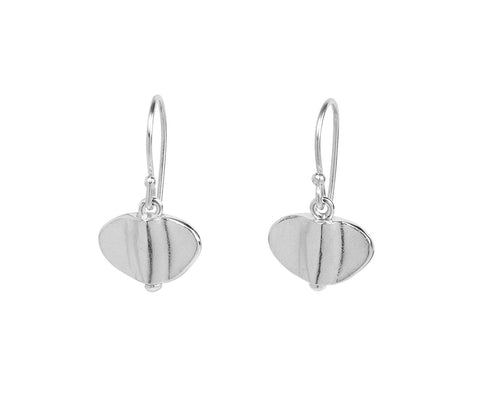 Little ovals of sterling silver have been hand-finished to a smooth, satiny finish. A raised peak runs vertically through them creating an interesting, sculptural effect. The movement they make while they dangle from the ear wires is subtle and mobile-like. Perfect everyday earrings!