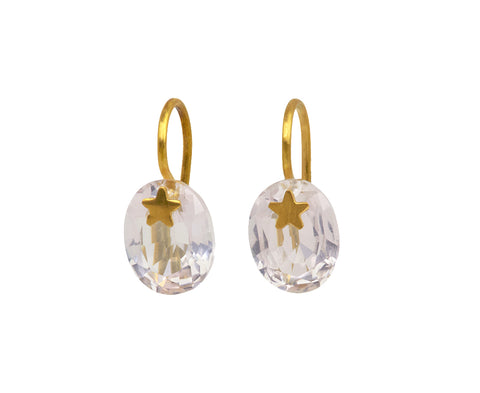 With their subtle, feminine color and perfect size, these Marie-Hélène de Taillac earrings have a sweet vibe. The oval pale pink rose quartz connect to gracefully curved 22K yellow gold ear wires by a tiny, 22K yellow gold star piercing the star.