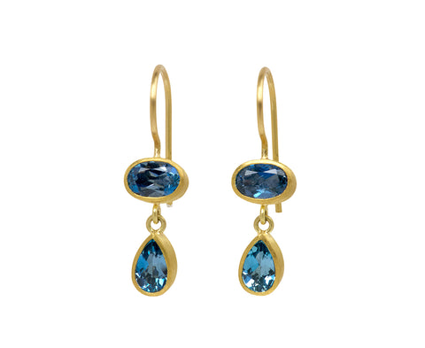 Absolutely exquisite in their neutral, monochromatic color, these Mallary Marks earrings exude a playful, iridescent elegance. The faceted dark blue aquamarine - one oval and one pear shaped - are encased in bezels of 22K yellow gold and hang from the 18K yellow gold ear wires.