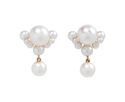 Sophie Bille Brahe has created the perfect pair of dramatic pearl earrings. A cluster of various sized white freshwater pearls attach to 14K yellow gold post backs with one larger pearl anchoring the composition. Elegant, yet bold, they can be worn with everything from casual to formal.