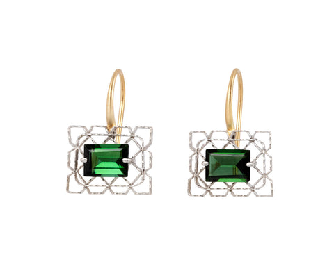 Stunning in their unparalleled intricacy, these Nikolle Radi earrings offer a hint of vibrant color. The royal green rectangular green tourmaline are set in platinum prongs and framed by a delicate hand fabricated platinum design. They hang from 18K yellow gold ear wires.