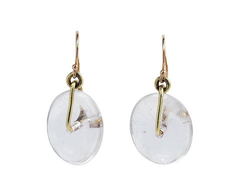 Sparse, modern, and sculptural, these Ten Thousand Things earrings still make a striking impact. The smooth, hand cut oval cushions of transparent rock crystal have subtle, visible crystallized inclusions and hang from 18K yellow gold molten drops and ear wires.