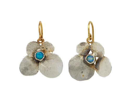 With their earthy design and sophistication,, these Judy Geib earrings are an understated version of her signature gold hydrangea drops. The sterling silver petals are set at a slight angle and surround the small, bezel set opal. They hang from 18K yellow gold ear wires.