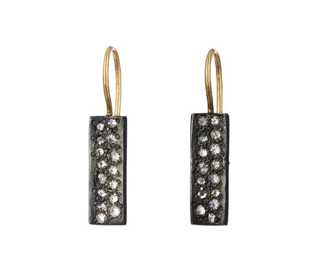 These captivating earrings by Todd Pownell are a stunning, reinterpretation of the diamond dangle earrings. The vertically situated rectangles of oxidized sterling silver are set with two rows of inverted brilliant cut diamonds. Modern, edgy and possessing an unexpected elegance, these earrings are a distinctive alternative to the traditional diamond dangle.