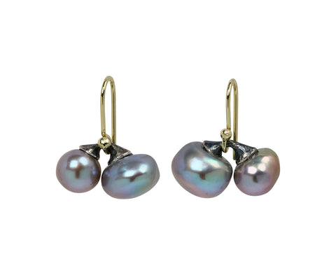 Dramatic and distinctive, these John Iversen earrings are a loose interpretation of toy jacks. Each end of the oxidized sterling silver spokes ends with a smooth, grey pearl and hangs from the 14k yellow gold ear wire to create a stunning geometric dimension. They are a stunning, eye-catching alternative to traditional pearl earrings.