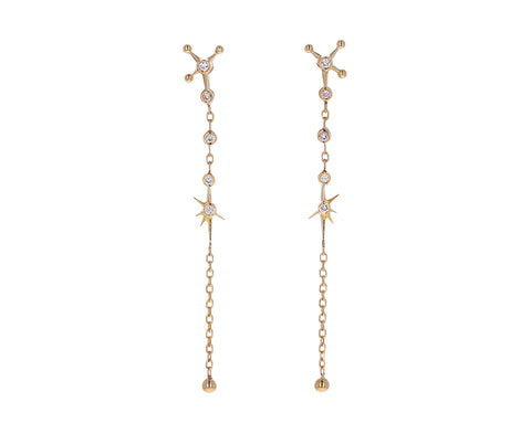 With their playful movement and celestial design, these Celine Daoust earrings also exude a modern sense of style. The 14K yellow gold stars and diamonds connect to one another and are anchored by a length of 14K yellow gold chain. The composition connects to 14K yellow gold post backs to create a pair of earrings you can wear with everything in your closet.