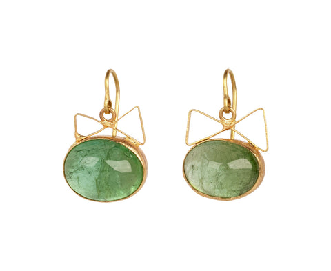 With a sweet design and cool toned color, these stunning Judy Geib earrings have a playful, easy to wear elegance. The smooth, oval green tourmaline are set in 18K yellow gold bezels beneath tiny 18K yellow gold angular bows. The sweet composition hangs from 18K yellow gold ear wires.