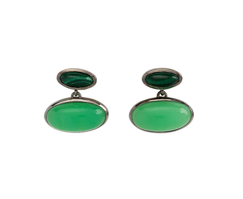 With their subtle color variation and cascade of movement, these Nak Armstrong earrings are from his mosaic inspired Nakard Collection. The duo of stones, one smaller malachite and one larger chrysoprase, are set in black rhodium plated sterling silver bezels. They attach to black rhodium plated sterling silver post backs to create a pair of earrings that will add the perfect pop of color to any outfit.