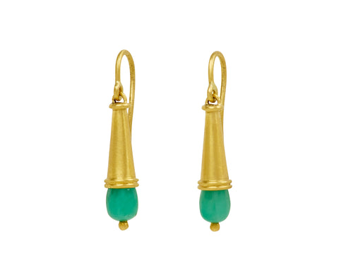 Inspired by the form of an alchemist's beaker, these Prounis earrings have an understated sophistication. The tapered, matte 22K yellow gold earring is capped with a small, opaque emerald. They hang from 22K yellow gold ear wires to offer a hint of movement.