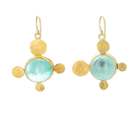 With a playful, earthy sophistication, Judy Geib has created a pair of stunning earrings combining her love of emeralds with her creative magic. Pale green Columbian emeralds are encased in 22K yellow gold and framed by 22K gold flat squash discs of different sizes. The intentionally asymmetrical composition dangles from the 18K yellow gold ear wires.