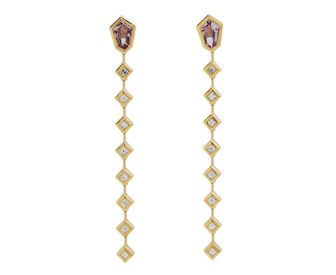 Stunning in their dramatic cascade and understated color, these Brent Neale earrings are ones you will build an entire look around. The kite shaped pale pink rose de france amethysts are set in 18K yellow gold bezels and connect to 18K yellow gold post backs. Eight bezel set, shimmering carre diamonds are separated by thin 18K yellow gold wire below, creating an earring with the perfect amount of movement.