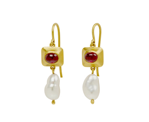 Stunning in their timeless sophistication, these Prounis earrings are the perfect, wear-with-everything pair. The smooth, oval rubies are set at the center of the matte 22K yellow gold rectangles which hang from the 22K yellow gold ear wires. An amorphous, white keshi pearl dangles below.