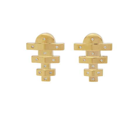 These playful, modern Brent Neale earrings beg for a closer look. The oversized 18K yellow gold studs depict tiny hopscotch boards, each set with shimmering white diamonds. They connect to 18K yellow gold post backs.