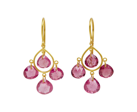 With their warm toned color and subtle movement, these Marie-Hélène de Taillac earrings have a sweet, understated elegance. Four pear shaped pink tourmaline hang from 20K yellow gold loops along a thin 20K yellow gold wire and hang from 20K yellow gold ear wires. Perfect no matter how you wear them.