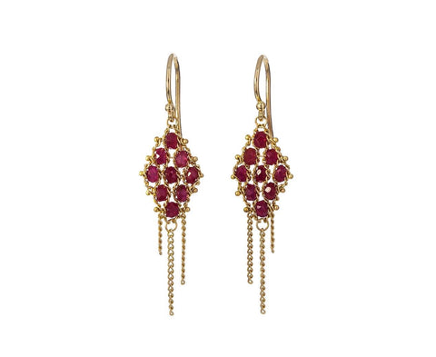 Quietly exuding a restrained, bohemian luxe, these Amali earrings also offer a hint of color and sparkle. A diamond-shaped configuration of deep red ruby beads are meticulously hand-woven into 18K yellow gold chain. Remaining chain hangs below adding to the stunning sophistication of these earrings.