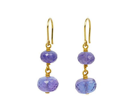 With their monochromatic color and subtle movement, these Mallary Marks earrings have an effortless sophistication. The two barrel shaped beads of faceted tanzanite hang below the 18K yellow gold ear wires. Wear them with anything in your closet.