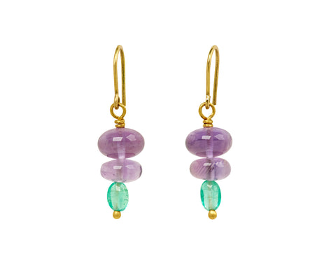With their stunning combination of jewel toned color and subtle movement, these Mallary Marks earrings have a bohemian elegance. Hanging from the 18K yellow gold wires are drops of tapered smooth amethyst and emerald beads which are strung on 22K yellow gold wire.
