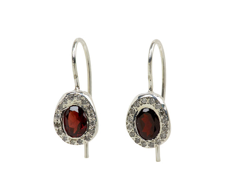 With a subtle hint of color and captivating sparkle, these Rosa Maria earrings are a step up from traditional, casual silver drops. The icy grey diamonds are set in polished sterling silver and surround the faceted garnet. The composition connects to the polished sterling silver ear wires.