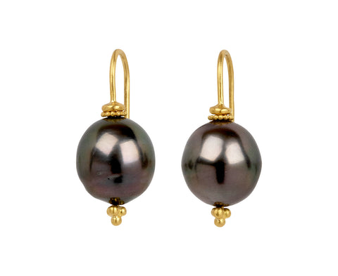 Perfectly representing the meeting of modern and antique design, these Prounis earrings are a stunning update on the traditional pearl drop. The gray Tahitian pearls are topped with meticulously hand crafted 22K yellow gold beaded granulation. The pearls are pin set to connect to the 22K yellow gold ear wires.