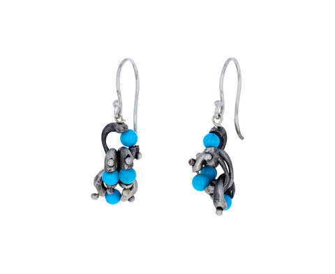 Modern and cool, these Ten Thousand Things earrings have a contemporary, edgy appeal. Four hand-fabricated, slightly oxidized sterling silver loops connect tiny, vibrant turquoise balls and dangle lightly from silver ear wires. With movement and casual style, these funky earrings are a perfect every day choice.