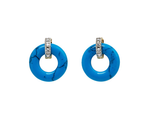 With their vibrant color and modern design, these Mateo earrings are an edgy update on the traditional gem drop. The 14K yellow gold three-dimensional studs are set with a surface of shimmering diamonds. Stunning donuts of deep blue turquoise dangle from the stud for the perfect hint of movement. Wear them with or without the drops for a pair of earrings that can be worn with anything.