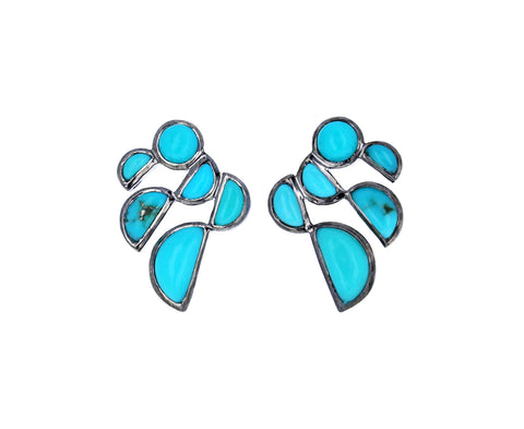 Bold, sculptural, and exuding an architectural vibe, these Nak Armstrong earrings are from his new Nakard Collection. Inspired by the geometric intricacy and patterns found in mosaics, these earrings are a series of vibrant sky blue turquoise framed in black rhodium plated sterling silver. The shapes connect to create a solid, post back pair of earrings.