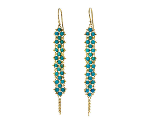 With an intricate, fabric-like fluidity, these vibrant Amali earrings combine saturated, sky blue turquoise beads with rich, 18K gold. The beads are meticulously hand-woven into the 18K yellow gold resulting in long, fluid drops which exude a bohemian elegance. Short strands of golden chain anchor the look while also adding subtle movement.