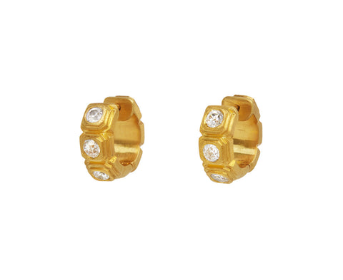 With their handcrafted texture, geometric design and stunning sparkle, these Darius hoops are an instant classic. Each round, white antique diamond is bezel set at the center of her signature fairmined 18K yellow gold ziggurat platform setting. Each of the six squares connects to one another and they closet with an 18K yellow gold latch back.