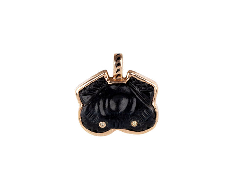 With its playful, beachy vibe, this Dezso charm pendant is a piece of blue tigers eye hand carved into the shape of a crab. It is set in an 18K rose gold bezel with diamond eyes and hangs from an enamel wave and 18K rose gold bale. Add it to any of your favorite necklaces or wear it solo for a surfer chic addition.