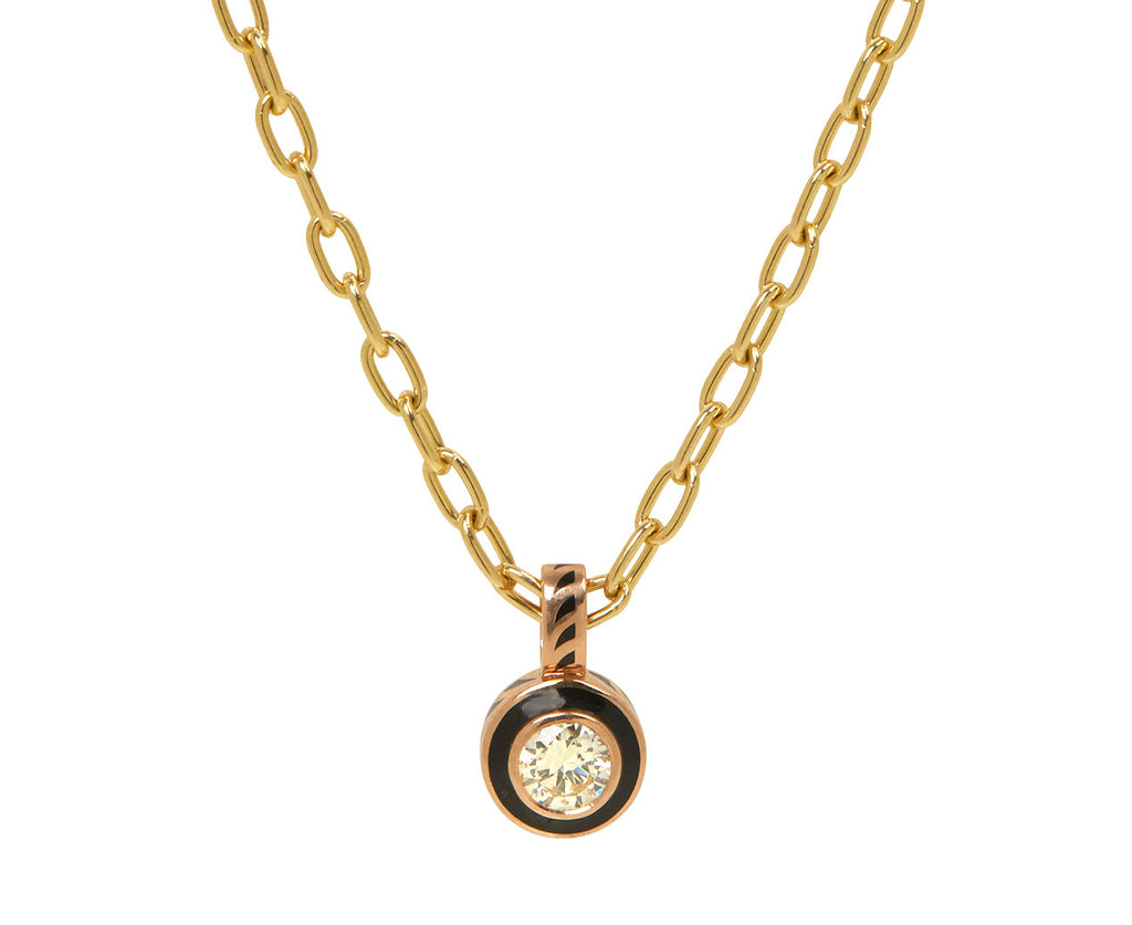 With its sophisticated, beachy vibe, this Dezso pendant is an easy addition to any collection. The pendant is made up of a sparkling round old mine diamond that is bezel set in the iconic rose gold painted with tiny black enamel shark fins and surrounded with black enamel.