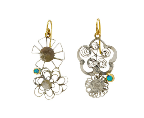 With their airy, earthy design, these Judy Geib earrings are a playful expression of her brilliant creativity. Each of the earrings is a double drop of hand-wrought sterling silver flowers set with one, bezel set smooth opal. They hang from 18K yellow gold ear wires.