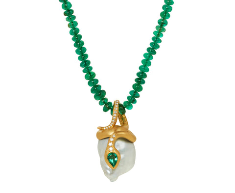 With its luxurious color and subtly edgy style, this Elva necklace has an effortless sophistication. The smooth, Zambian emerald beads are strung along green silk and close with an 18K yellow gold toggle clasp. The 18K yellow gold winding snake is set with shimmering diamonds along its tail and a pear shaped emerald on its head. It connects to the large, south sea pearl, creating a necklace that begs for a closer look.