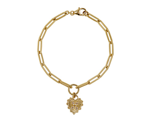 With its stunning sparkle and sweet sentiment, this Foundrae bracelet looks stunning alone or layered with your other favorites. The 18K yellow gold heart has an engraved surface set with a shimmering white diamond bowens knot. The charm hangs at the center of the 18K yellow gold fob clip chain and is sure to add an effortless vibe to your collection.