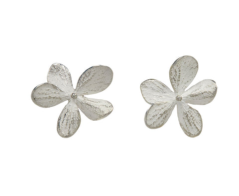 These exquisite John Iverson earrings are a beautifully rendered interpretation of a single hydrangea flower. Hand-wrought in stark white sterling silver and lovingly detailed, they have a distinctive, artistic sophistication.