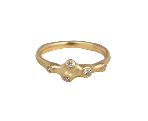 With its sculptural earthiness and asymmetrical design, this Johnny Ninos ring has a modern, feminine style. A cluster of sparkling diamonds nestle together in the 18K yellow gold barnacle-like setting at the center of the 18K yellow gold band. Alone, it has an understated, modern vibe, but it pairs perfectly with any of Johnny's solitaires.