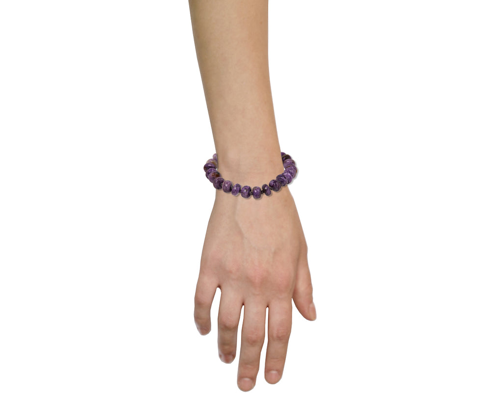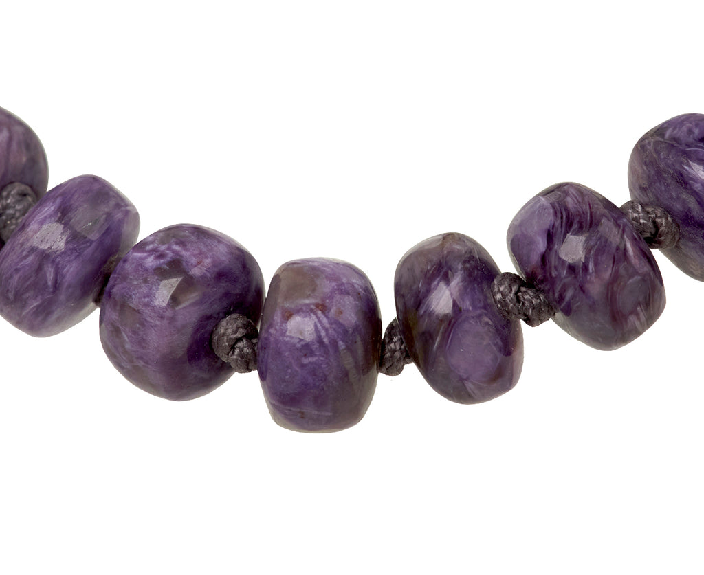 With an earthy, understated and effortless, casual style, this Joseph Brooks bracelet will fit in with any personal bracelet collection. Each of the deep purple and lavender smooth charoite beads is knotted along the deep purple nylon cord. These stones are believed to stimulate your inner visions and release fears. A powerful stone with deep physical and emotional healing energy.
