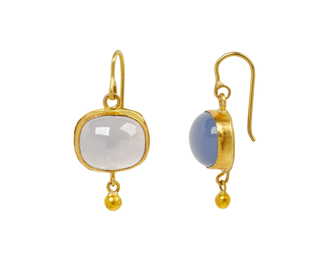 In their stunning shade of opaque lavender-blue, these Judy Geib earrings exude a timeless sophistication. The smooth, rectangular blue chalcedony are framed in 18K yellow gold and anchored by a tiny 18K yellow gold ball. They hang from 18K yellow gold ear wires.
