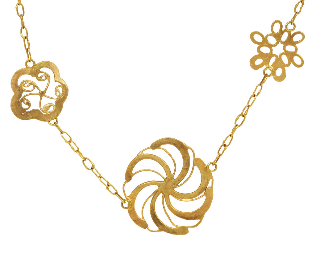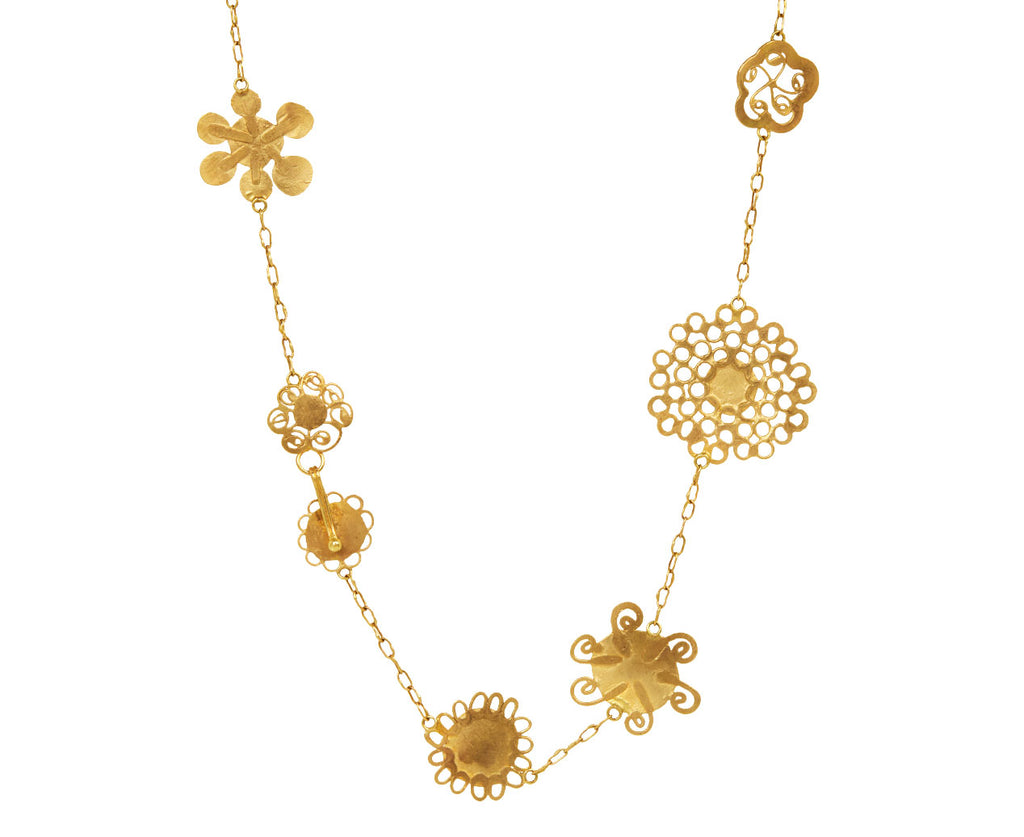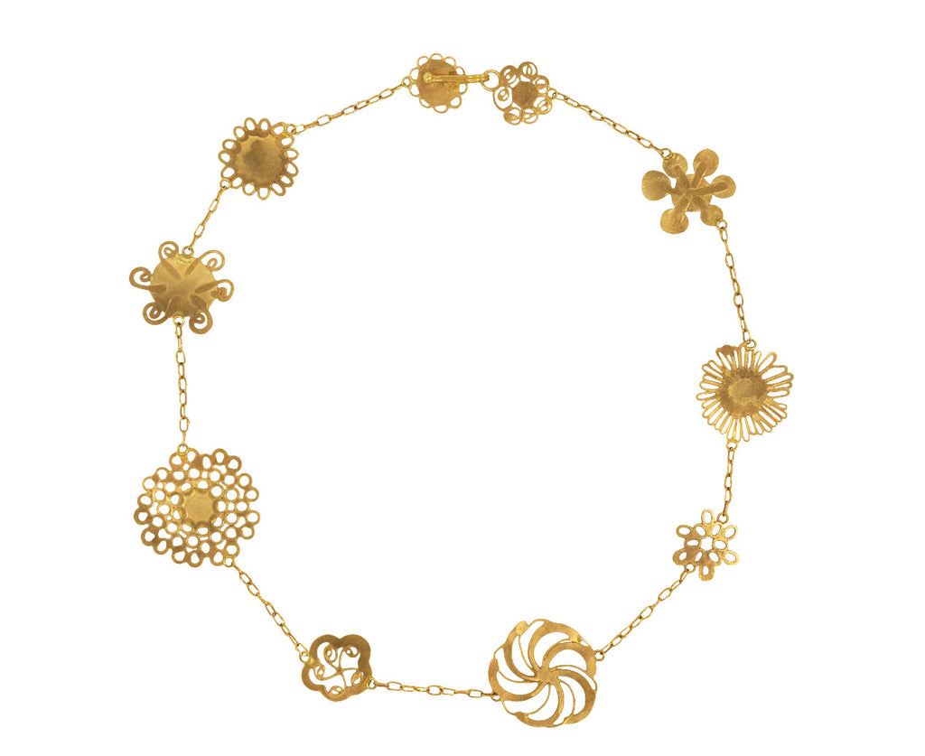 Whimsical and elegant, this Judy Geib necklace is an artistic balance of shape and space. Graceful loops and flowery geometry create airy floral shapes composed of 18K yellow gold. Meticulously hand-crafted, each link is connected by strands of 18K yellow gold chain. Fluid and sophisticated, this necklace is most certainly a piece of wearable art.