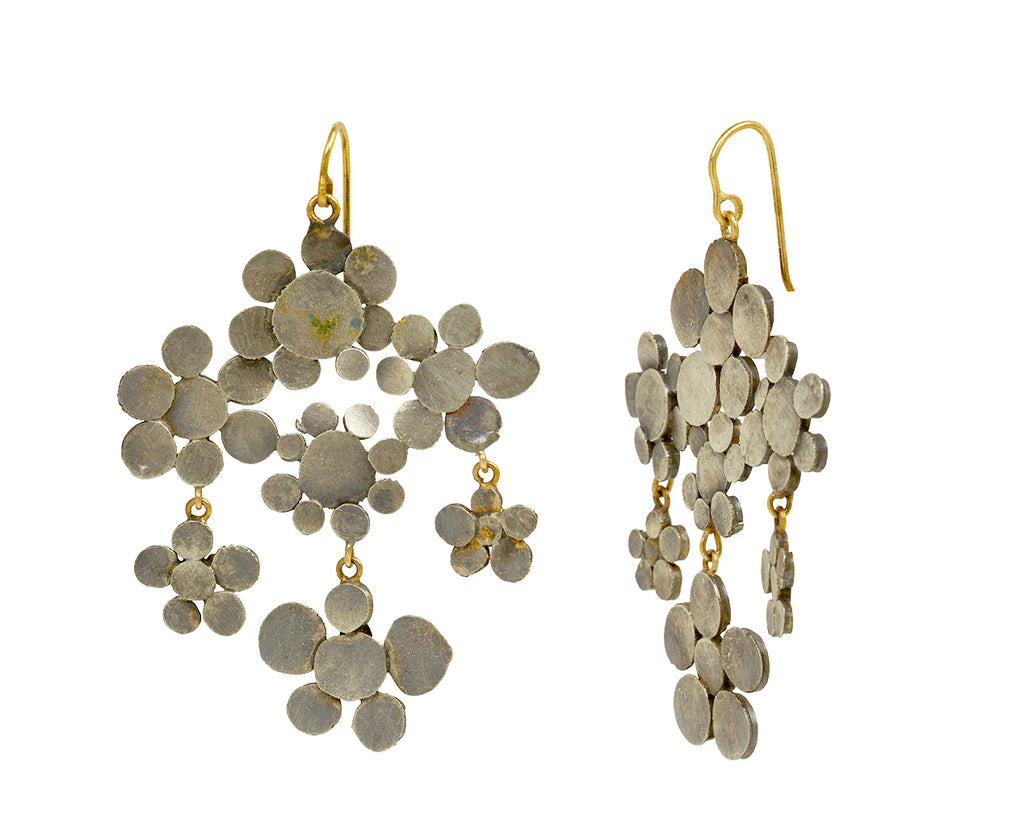 Playful, airy, and full of movement, these earthy Judy Geib earrings are a perfect balance of form and space. The top four sterling silver flowers connect to one another and are anchored by three dangling additional flowers. The intentionally mis-matched composition hangs from 18K yellow gold ear wires.