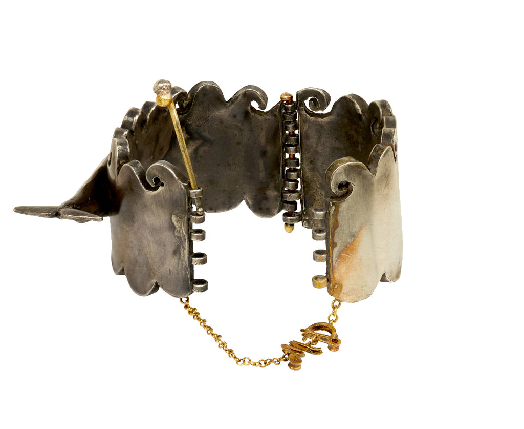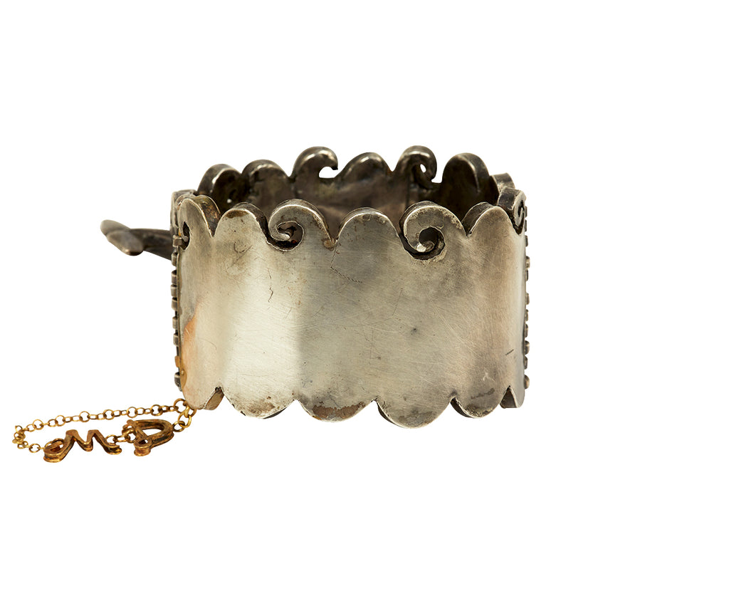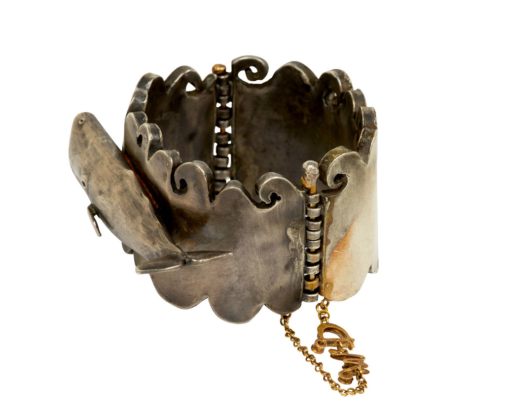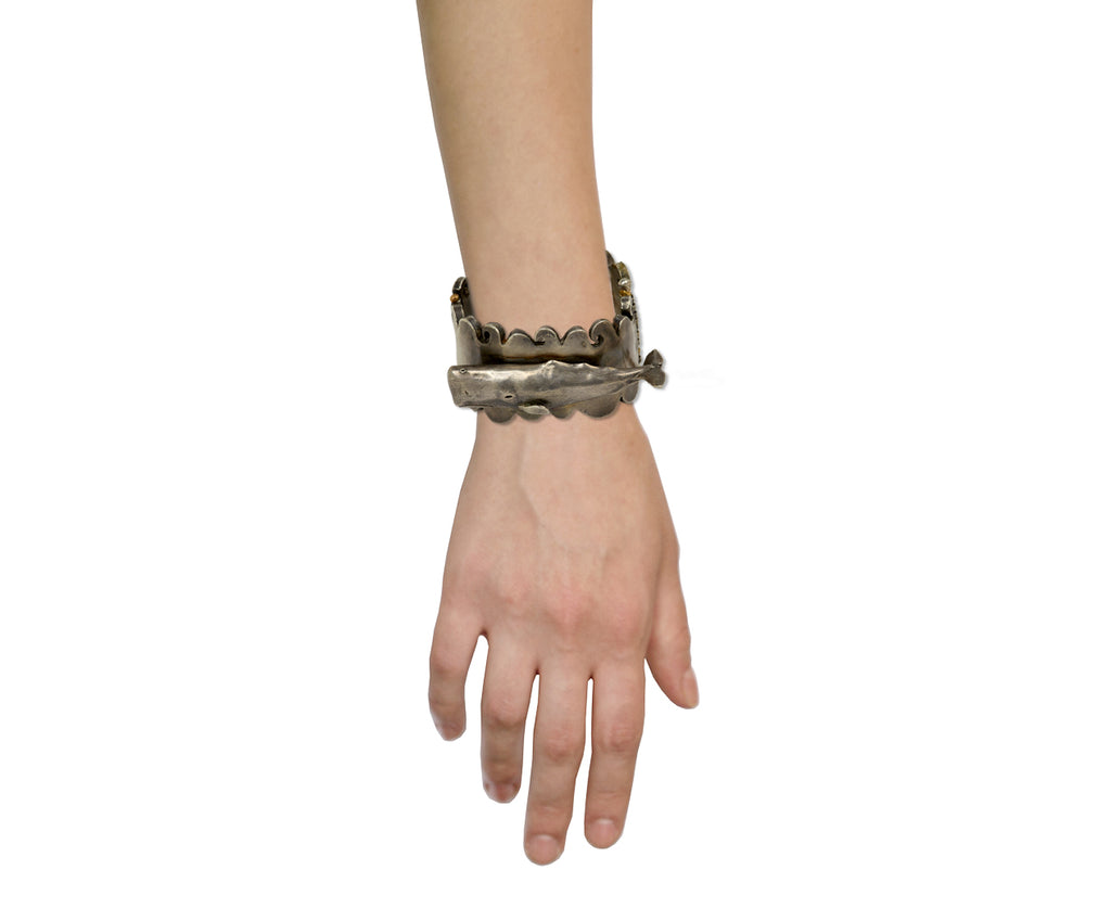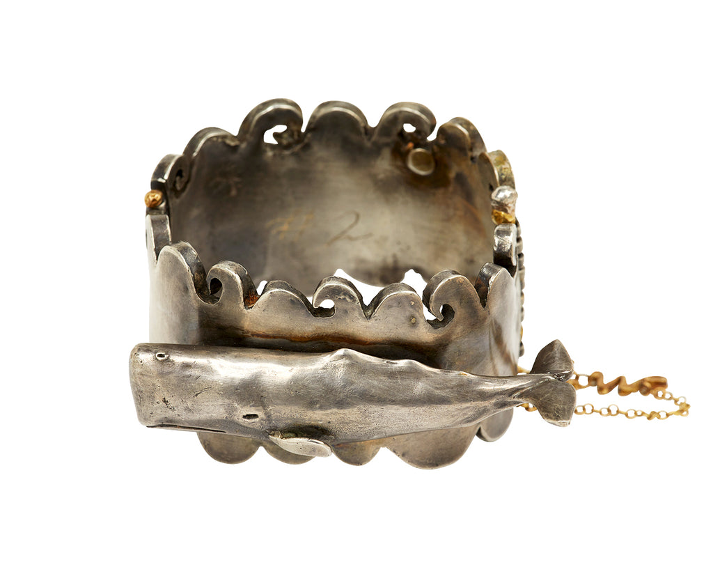 Inspired by her feat of completing the Herman Melville classic Moby Dick, Judy Geib has paid hommage to the famous antagonist with this bold bracelet. The hand made cuff of dimensional sterling silver has both scalloped and waved edges. The sculpted Moby Dick swims across the top surface of the cuff which is hinged. It fastens with an 18K gold pin and safety chain with the initials M.D. As playful as it is style-defining, this is the perfect piece of one-of-a-kind jewelry for the literary fan and serious collector.