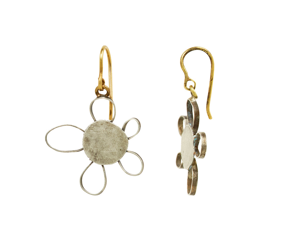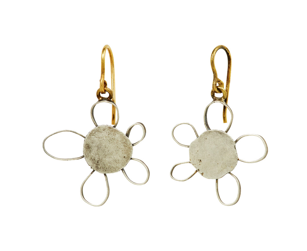 Playful and airy, these Judy Geib earrings are a perfect balance of form and space. The open sterling silver flowers are both funky and playful and hang from 18K yellow gold ear wires. Perfect no matter what you're wearing.