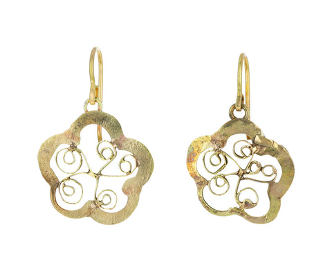 Stunning in their striking simplicity, these Judy Geib earrings are a delightfully geometric composition. Hand-wrought from 18K gold, each flower is made up of spiral playful petals. They dangle from 18K yellow gold ear wires and cheer up even the most straightforward outfit.