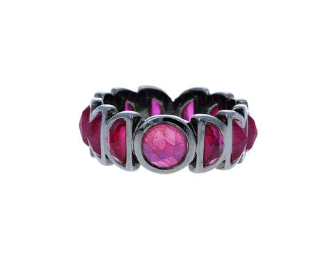 With its bold, modern vibe, this Nak Armstrong ring is from his Nakard Collection. The faceted dome of merlot red ruby is set in black rhodium plated sterling silver and is surrounded by a continuous band of faceted ruby semi circles. Wear it solo or top off your stacking collection with it!