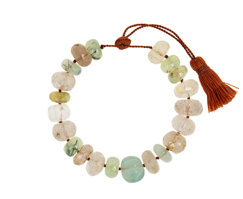 With a rustic style and easy-to-wear allure, this Lena Skadegard bracelet is one you will never want to take off. Faceted and smooth flourite, aquamarine, quartz and moss agate stones are arranged along a tan cord to create an eye-catching bracelet. Finished with an adjustable slide closure, this bracelet is a standout on its own or layered with your other favorites.