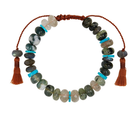 With a rustic style and easy-to-wear allure, this Lena Skadegard bracelet is one you will never want to take off. Faceted and smooth labradorite, turquoise and quartz stones are arranged along a tan cord to create an eye-catching bracelet. Finished with an adjustable slide closure, this bracelet is a standout on its own or layered with your other favorites.