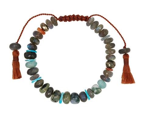 With a rustic style and easy-to-wear allure, this Lena Skadegard bracelet is one you will never want to take off. Faceted and smooth labradorite, turquoise, quartz and carnelian stones are arranged along a tan cord to create an eye-catching bracelet. Finished with an adjustable slide closure, this bracelet is a standout on its own or layered with your other favorites.