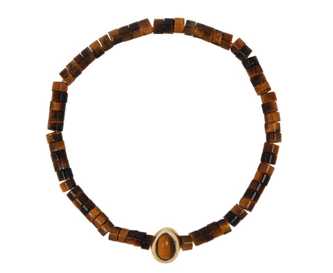 This Luis Morais bracelet is perfect nestled in with your wrist full of favorites or on it's own. The tigers eye beaded bracelet has a 14K yellow gold oval charm in the center set with a tigers eye.